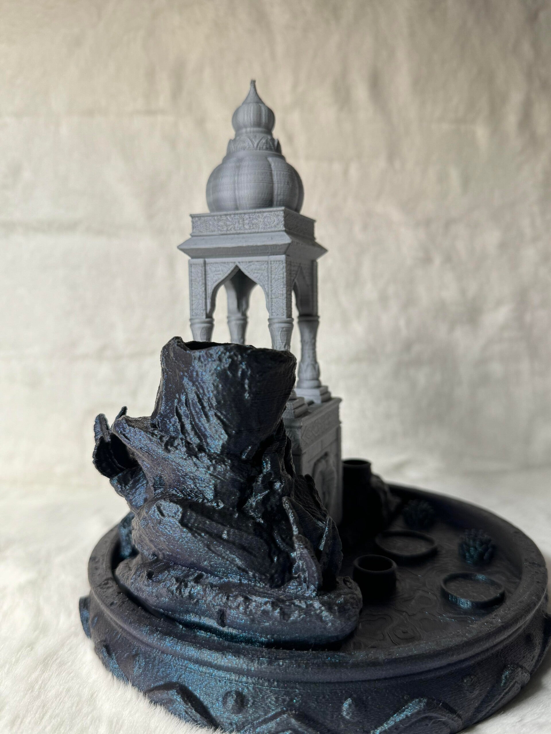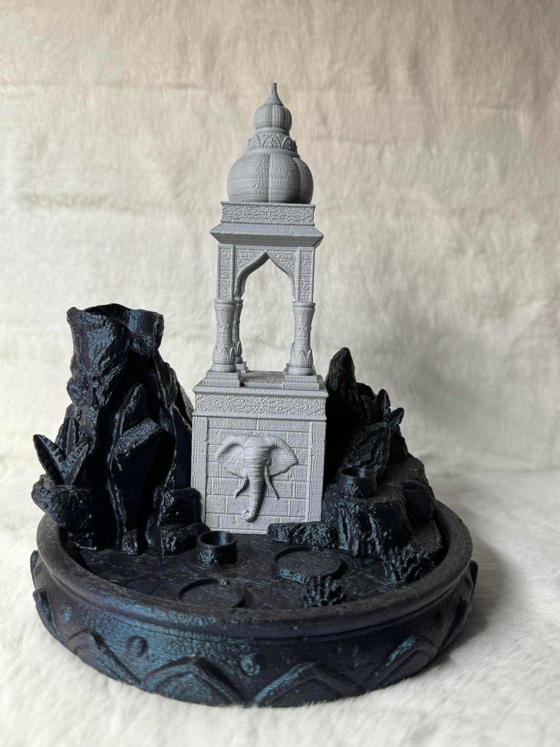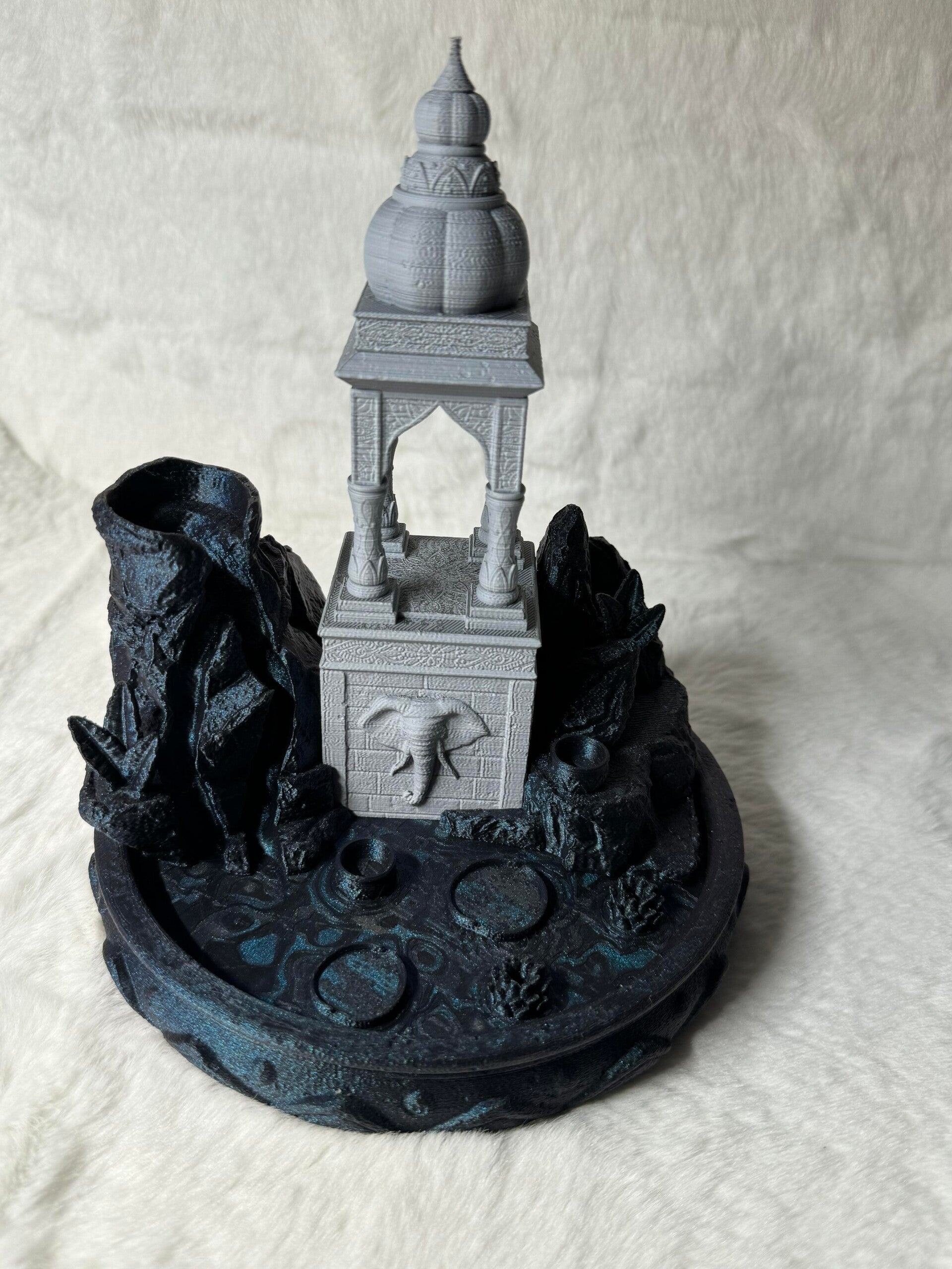 This beautiful temple-style backflow incense burner features an intricately detailed elephant head atop the temple. The burner rests in a serene pond base adorned with delicate lily pads, creating a peaceful scene as the smoke cascades downward like flowing water. Perfect for adding tranquility and charm to any space.